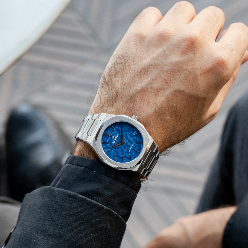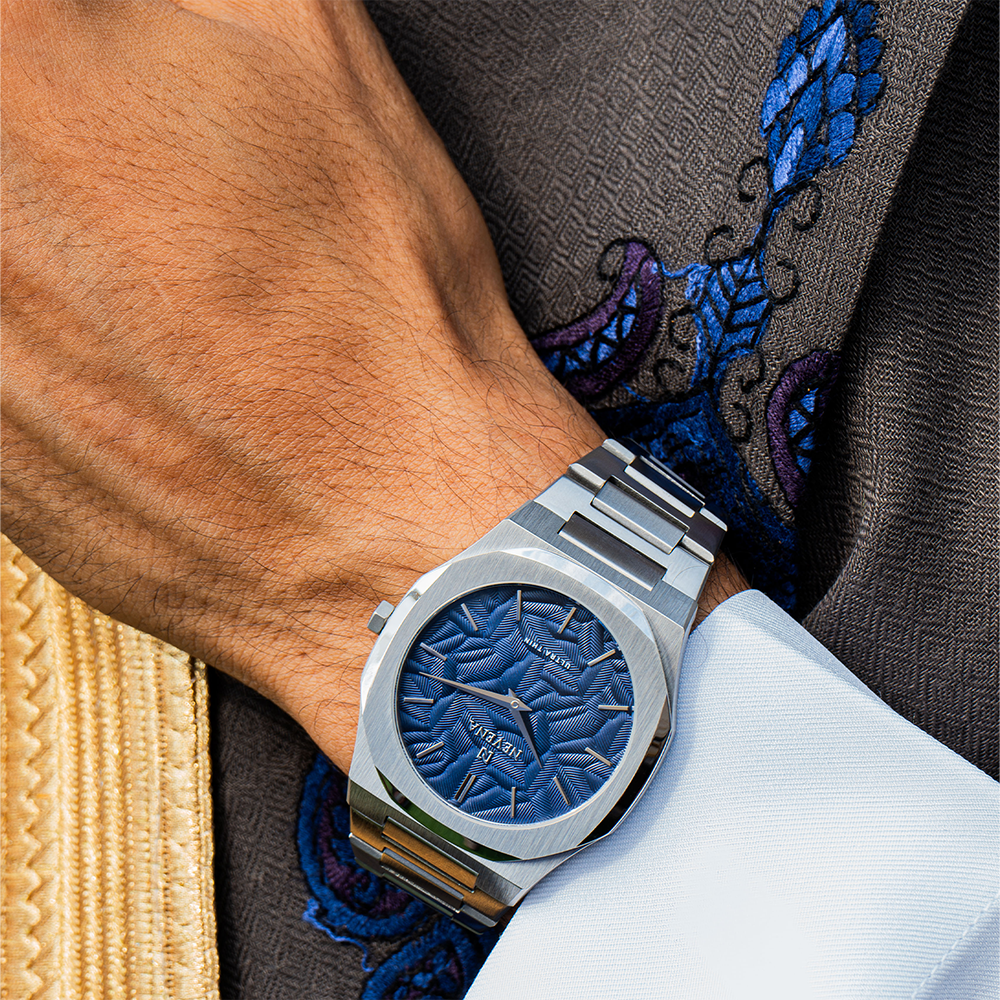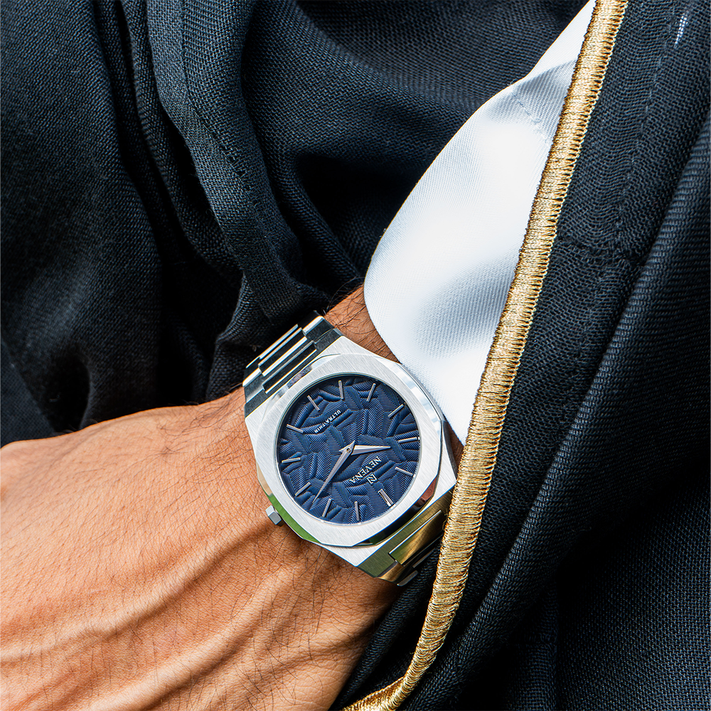 - ميناء الساعة بلون ازرق مع تفاصيل مميزه تجلب الأنظار.